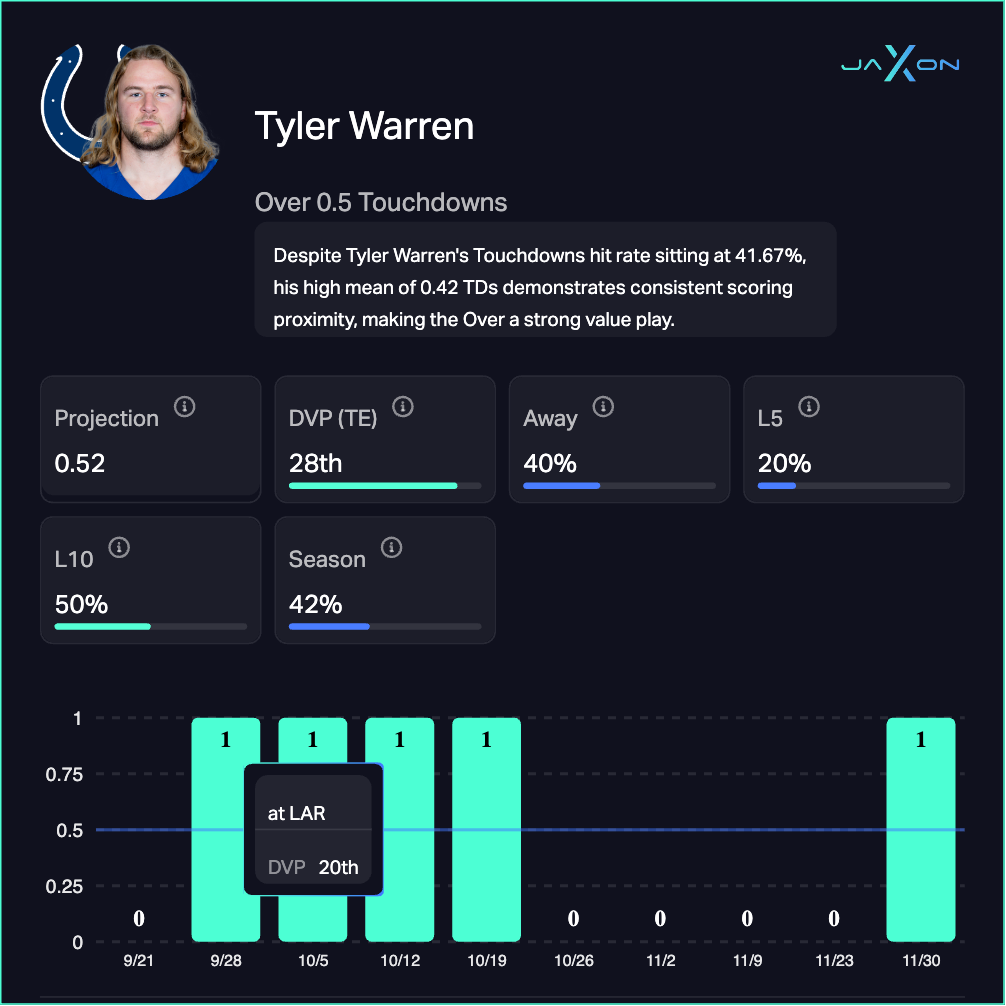 That's exactly what you're getting with Tyler Warren at +175 to score a touchdown in the Colts-Jaguars matchup. While the public continues to bet on Jonathan Taylor and Travis Etienne despite worse odds, professional bettors see value in Warren due to his favorable matchup, increased red zone targets, and role in the offense. Here's why they're right.