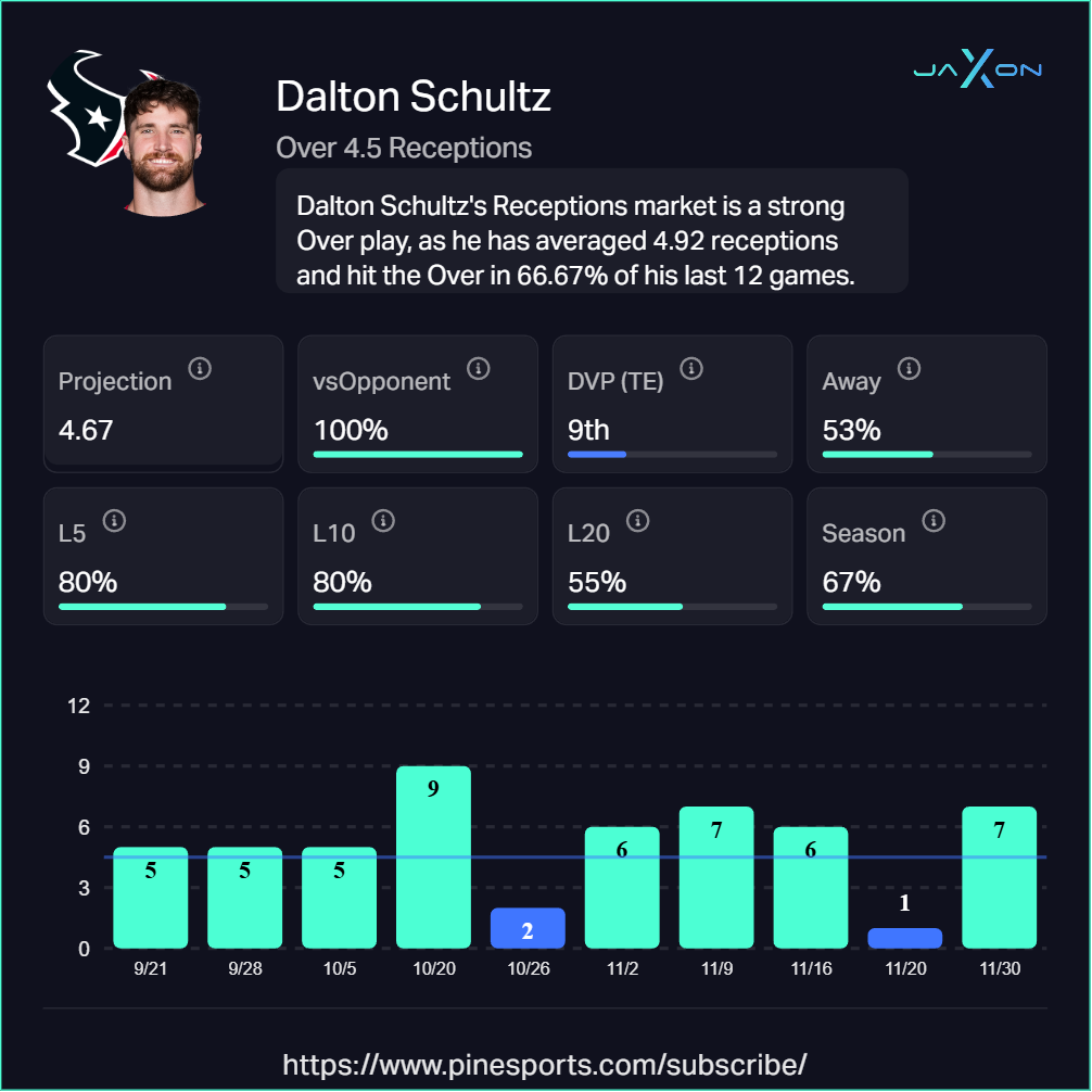 Schultz has been remarkably consistent, averaging 4.92 receptions per game and ranking fourth among all tight ends in that category. He's cleared this 4.5 mark in four of his last five games, averaging 5.4 catches during that stretch. Schultz's 19% target share (fifth among tight ends) becomes even more crucial to Houston's ability to move the chains this week. Against a Chiefs defense that surrenders completions at the highest rate in the league, Schultz should see plenty of targets.