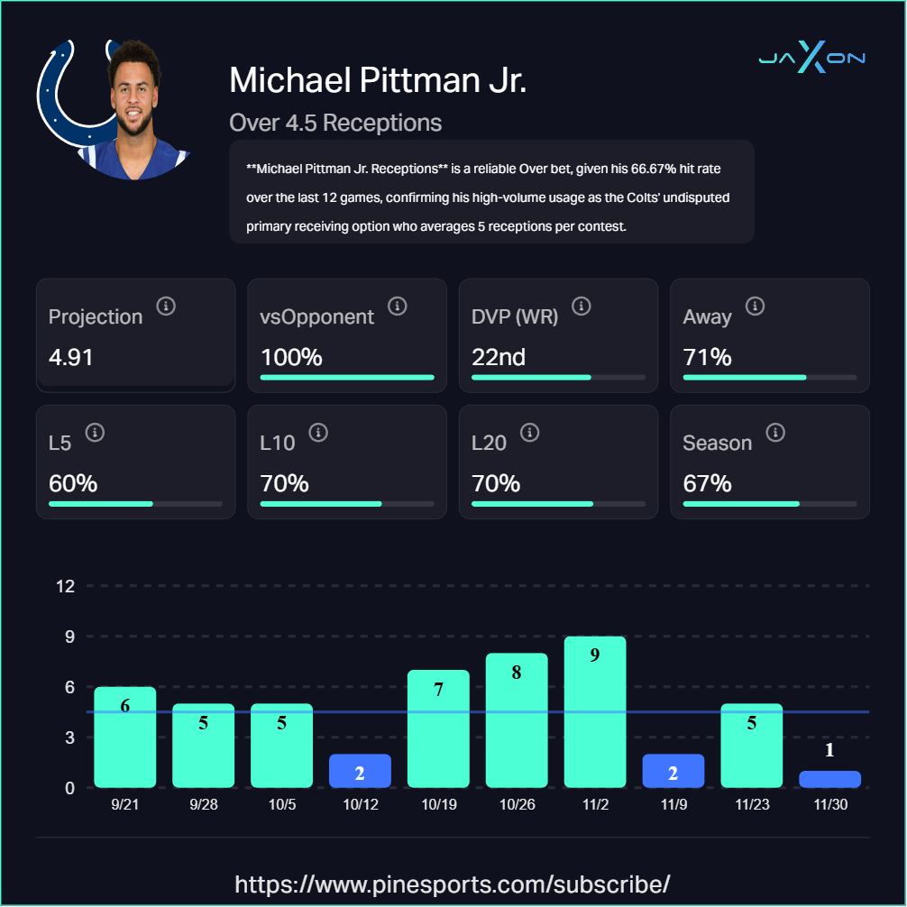 Pittman has been Daniel Jones' most reliable target all season, hauling in five catches per game with a solid 73% catch rate. On the road he's hit over 4.5 receptions in every single game this year, averaging 6.4 catches in those contests. Jacksonville ranks 29th in receptions allowed to opposing receivers, creating a perfect storm for Pittman to see double-digit targets.
