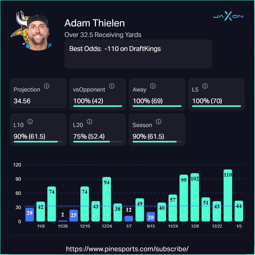 Jaxonâs Take: Veteran security blankets matter when rookies debut. Thielen has smashed this number in 100% of his last 5 games and is averaging north of 60 yards per game across a large sample. McCarthyâs likely to lean on short, safe throws which is exactly where Thielen thrives.