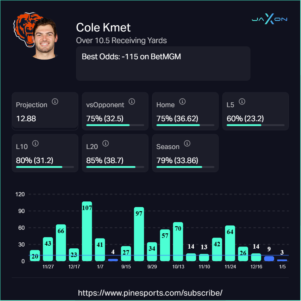Jaxonâs Take: This line feels disrespectful. Kmet averaged nearly 34 yards per game last season and cleared 10.5 in 79% of games. Against Minnesota last year? 39 per game and 2-for-2 on overs. New HC Ben Johnson knows how to feed tight ends, so expect schemed looks early.