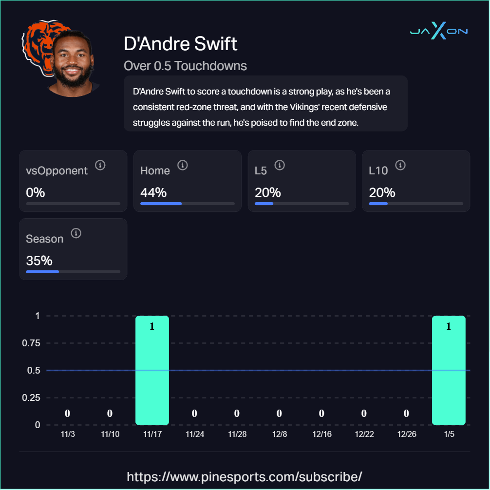 Monday nightâs Bears-Vikings matchup sets up plenty of red zone drama, and a few names stand out as legit touchdown threats. From Jeffersonâs star power to Swiftâs comfort zone, here are three players worth circling for anytime TD bets.