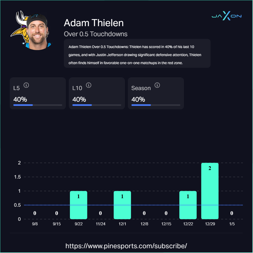 Addisonâs suspension elevates Thielen into the No. 2 role, and heâs long been a trusted red zone option. His odds are often friendlier than Hockensonâs, yet he still converts plenty of looks inside the 20. Solid value play here and I like the sneaky upside.