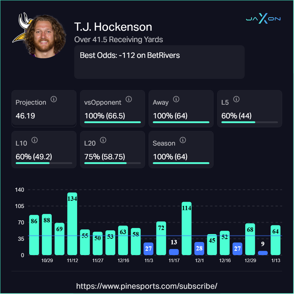 T.J. Hockenson (MIN) Over 41.5 Receiving Yards (-112)