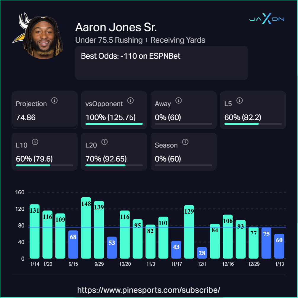 Jaxonâs Take: With QB J.J. McCarthy making his first start, expect a heavy dose of checkdowns and safe throws. That plays right into Jonesâ dual-threat skillset. Heâs cleared this number in 80% of his last 5, 75% of his last 20, and has shredded the Bears in recent matchups.