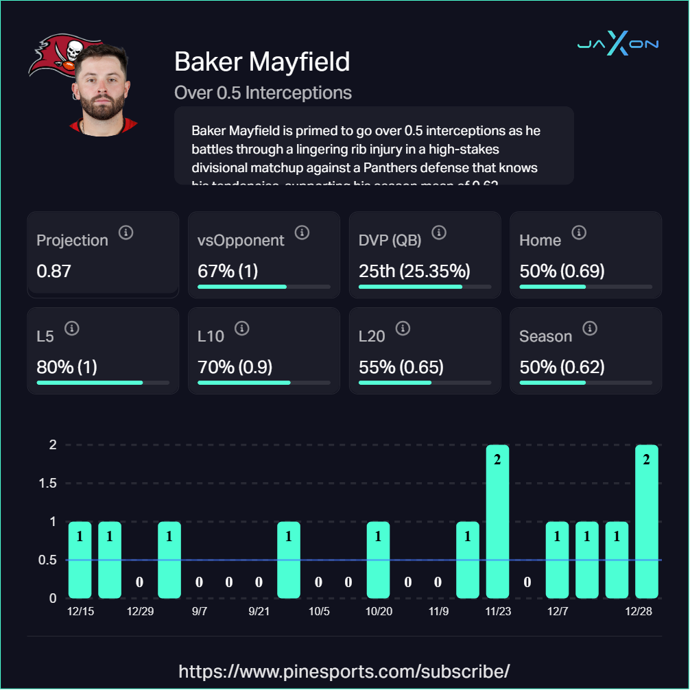 The matchup screams interception. Carolina ranks 7th in the NFL with 14 interceptions (0.87 per game) and 8th in interception rate defense (2.68%). Mayfield has been sacked 34 times this season, and while Carolina's sack rate is low (26th), their ability to force him to hold the ball too long or throw into tight windows has consistently resulted in turnovers.