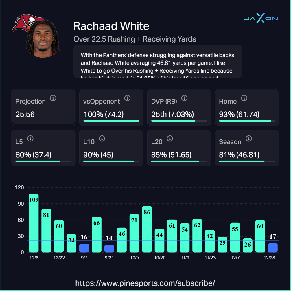 This line is absurdly low for a player averaging 46.81 total yards per game and hitting the over in 81.25% of his games this season. White has cleared this number in 90% of his last 10 games and 85% of his last 20 games. Even with Bucky Irving taking more traditional rushing attempts, White remains a vital part of the passing game, ranking 10th among all RBs in receptions (38) and 4th in red zone receptions (9).