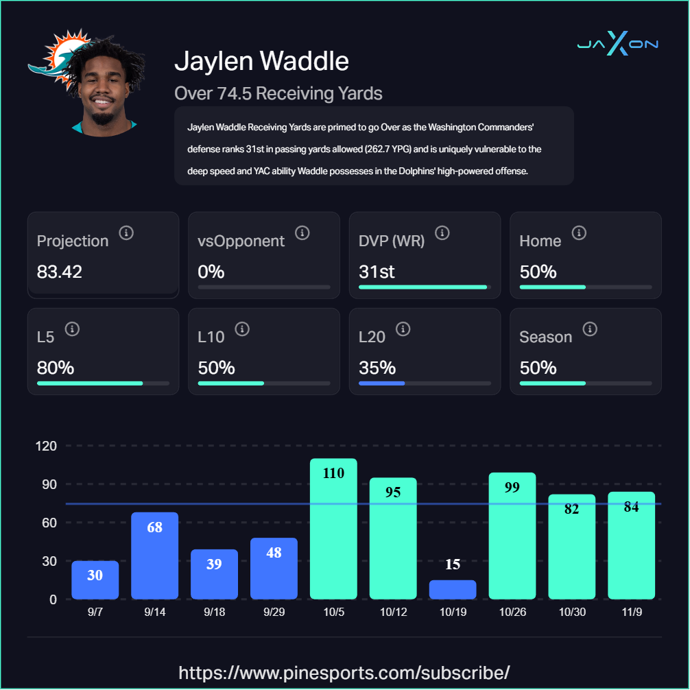 Waddle has already demonstrated he can shoulder increased responsibility without Hill on the field. He's posted at least 82 receiving yards in three straight games and cleared that threshold in five of his last six. The volume is there, the efficiency is there, and now he faces a defense that has surrendered 74+ receiving yards to an opposing wideout in four consecutive games. Commanders cornerback Jonathan Jones carries a dismal 37.0 PFF coverage grade, Waddle should operate in favorable coverage all afternoon.