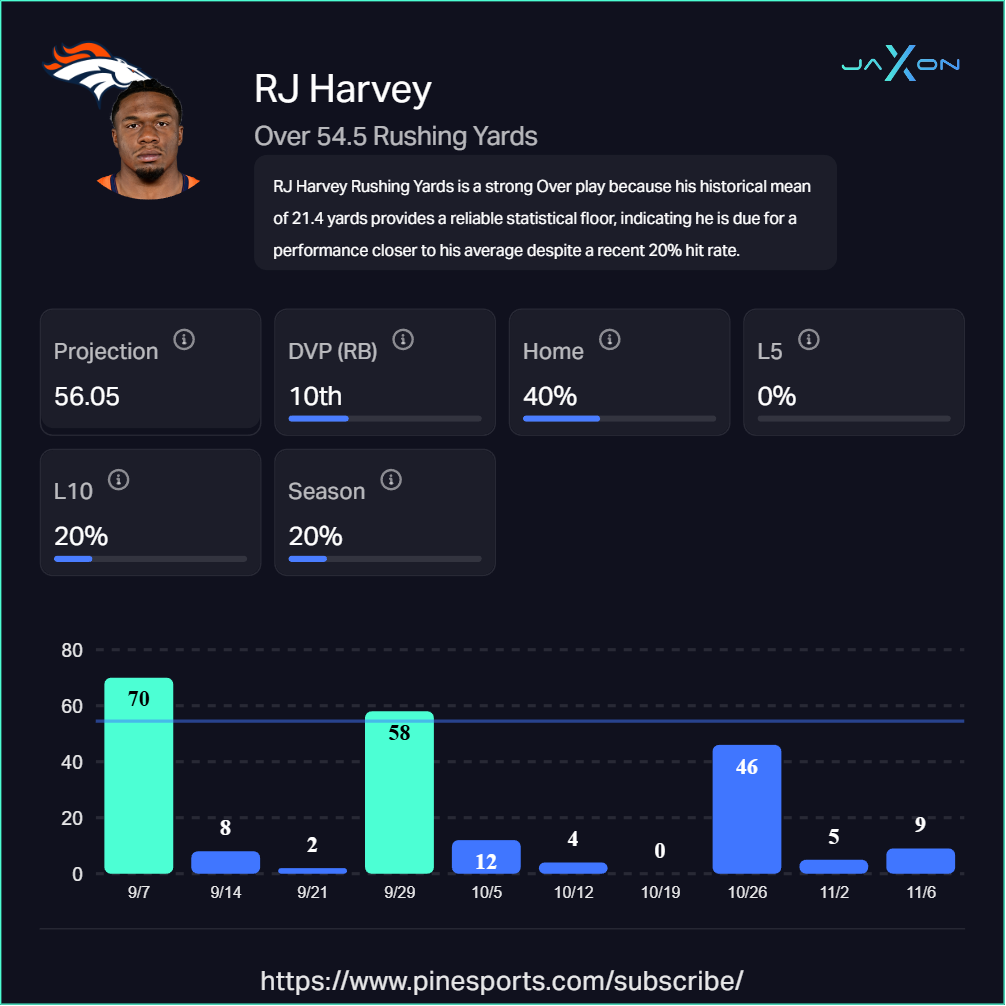 RJ Harvey Over 49.5 Rushing Yards (-115)