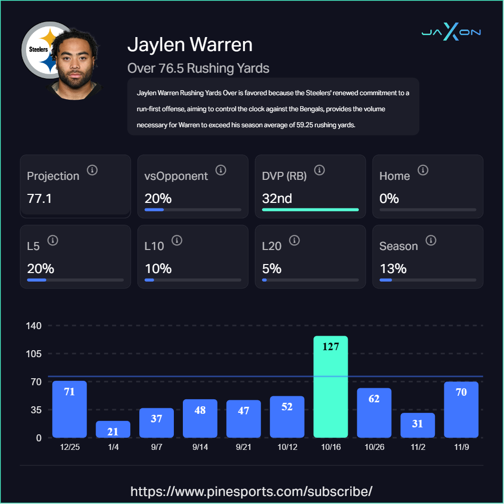 Warren has cemented himself as Pittsburgh's workhorse back, commanding 73% of the running back carries over the past five games. While the Steelers' rushing attack has been inconsistent overall this season, ranking 28th in yards per carry, matchup context matters tremendously.