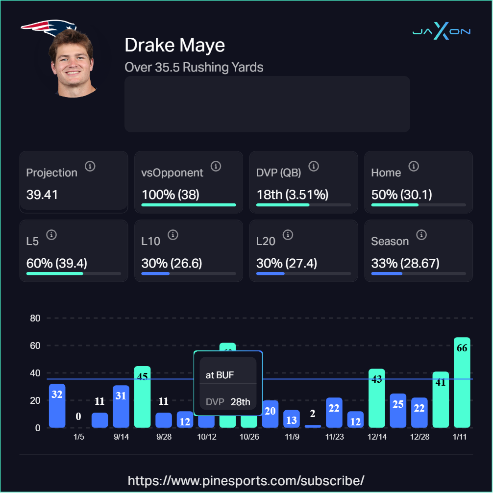 While the Texans' defense is arguably the best unit in the league, the disparity at the quarterback position is too large to ignore. Maye is playing at an MVP level, leading the league in EPA and completion percentage, and he possesses the specific scrambling ability to exploit Houston's lone defensive weakness.