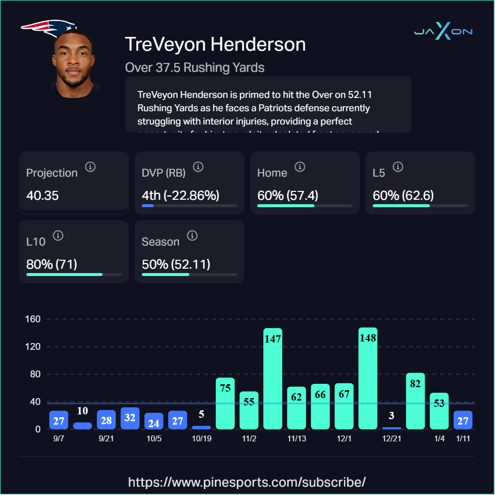 Two factors suggest Henderson will have a quieter game. First, Henderson continues to split work with Rhamondre Stevenson. In last weekās Wild Card win, Stevenson played 62% of the snaps compared with Hendersonās 41%. As playoff intensity ramps up, the lead back typically absorbs more of the workload.