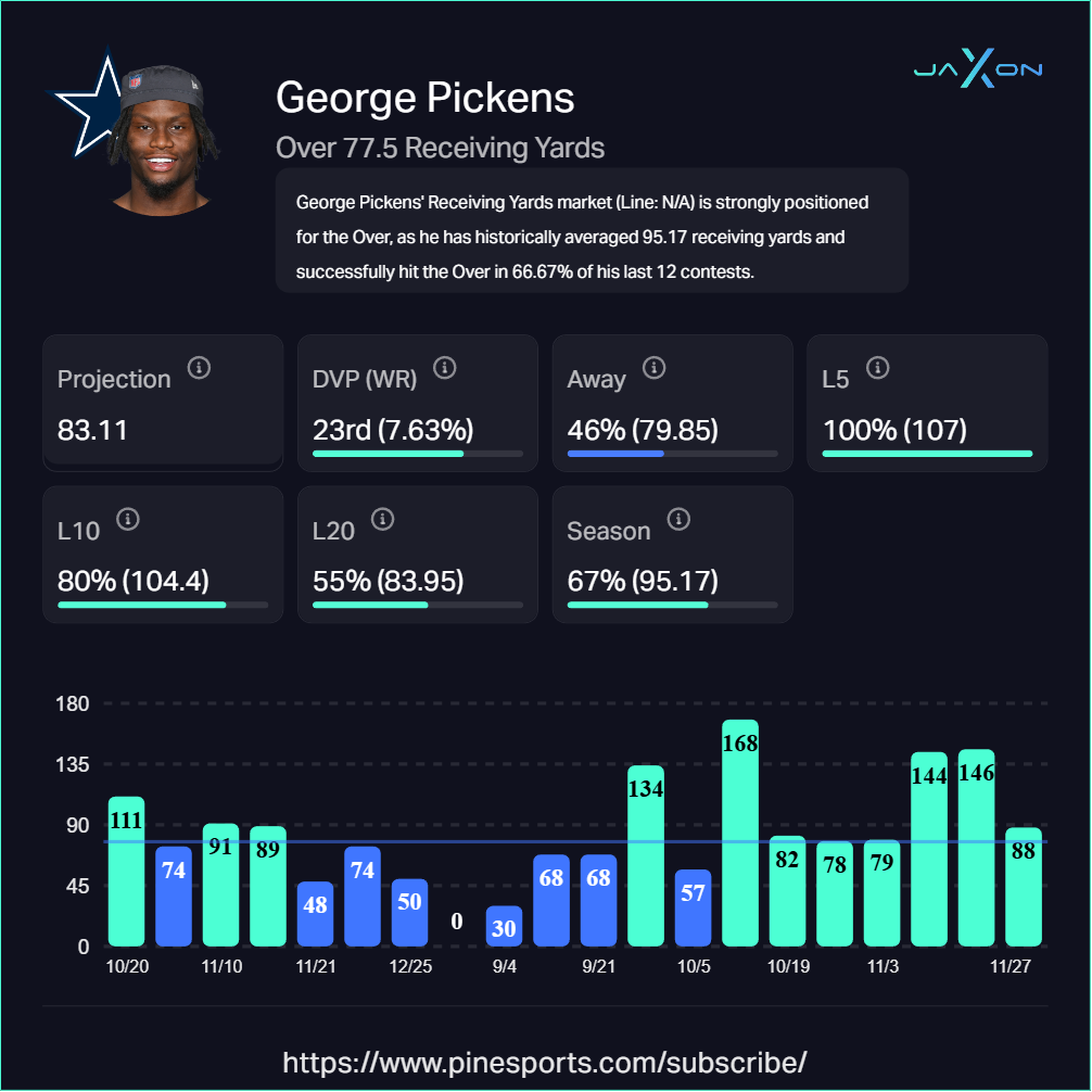 Pickens has been absolutely dominant, and the Lions' secondary is his latest victim waiting to happen. Detroit ranks 23rd against wide receivers in receiving yards allowed and 31st in yards per reception allowed (12.81). Pickens is averaging 95.17 receiving yards per game this season and has hit the over on this line in 80% of his last 5 games, averaging 107 yards during that stretch. He's cleared 78 yards in seven straight contests.