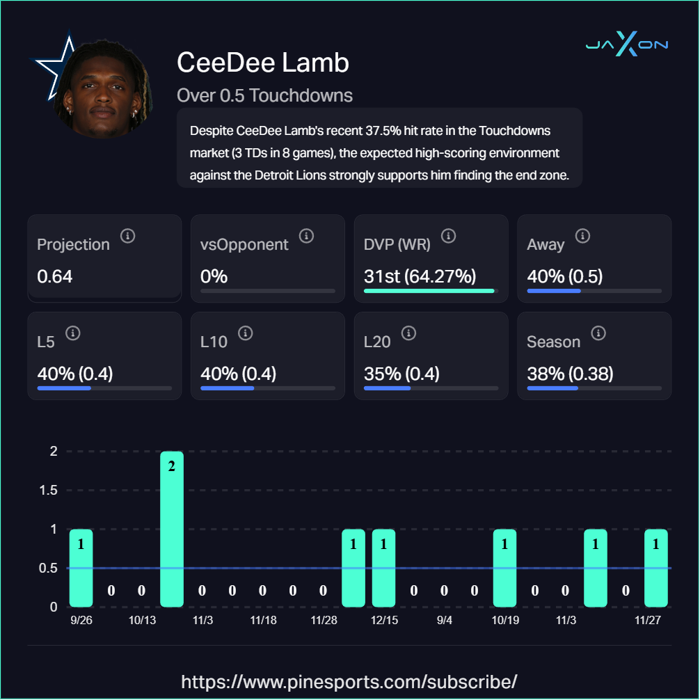 Getting Lamb at plus money in this spot is excellent value. He's the clear alpha receiver in Dallas's offense, commanding 10.12 targets per game (3rd among all WRs), and the Lions' secondary is a statistical disaster. While Lamb's season touchdown total (3) seems surprisingly low for someone with his volume, that's exactly why this is appealing. The positive regression is coming, and what better time than against the league's worst pass defense?