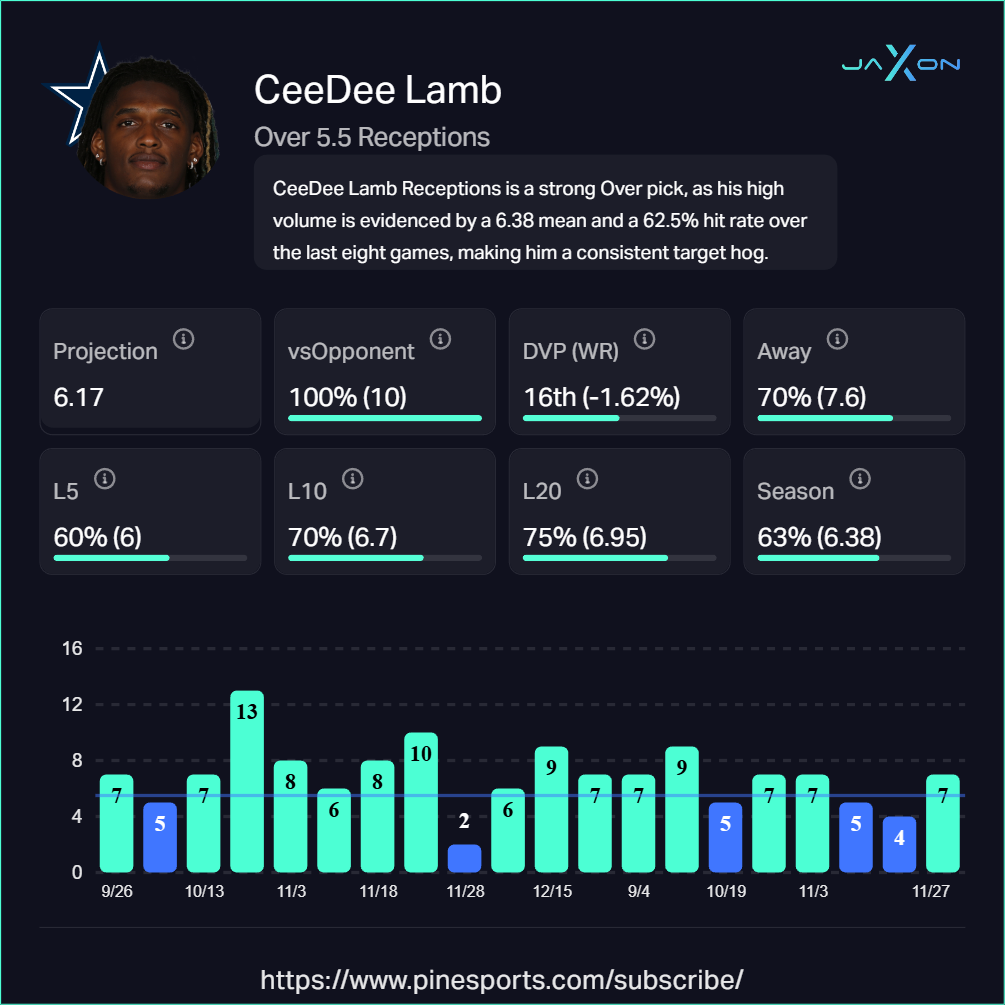 While Pickens gets the deep shots, Lamb remains the high-volume target in Dallas's offense, averaging 10.12 targets per game (3rd among all WRs). His 6.38 receptions per game average clears this line comfortably, and he's hit the over in 75% of his last 20 games. Lamb has caught 4 or more passes in all eight of his full games this season and recorded 7 receptions against the Lions last year.