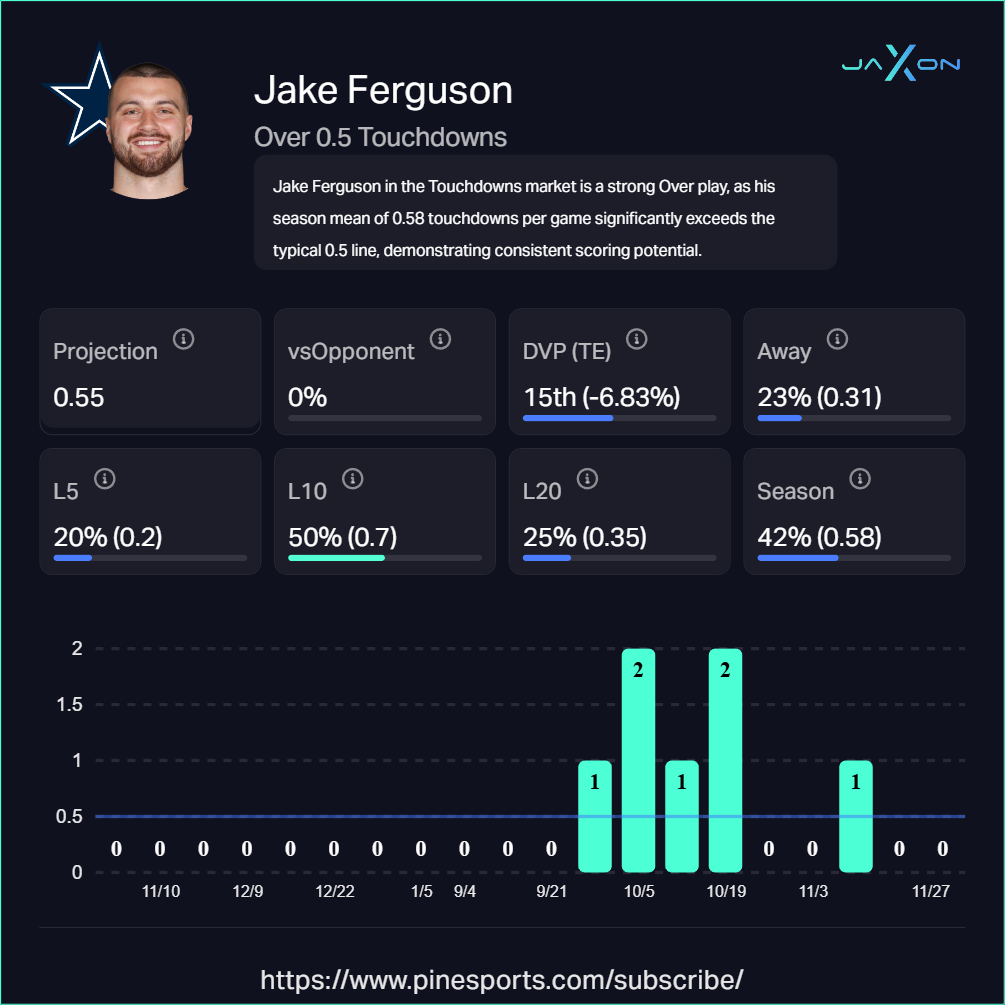 Ferguson offers fantastic odds at +160 because he's Dak Prescott's most trusted target when the field shrinks. The numbers are staggering: Ferguson ranks 1st among all tight ends in targets inside the 10-yard line (10 total) and 1st in targets inside the 5-yard line (7 total).