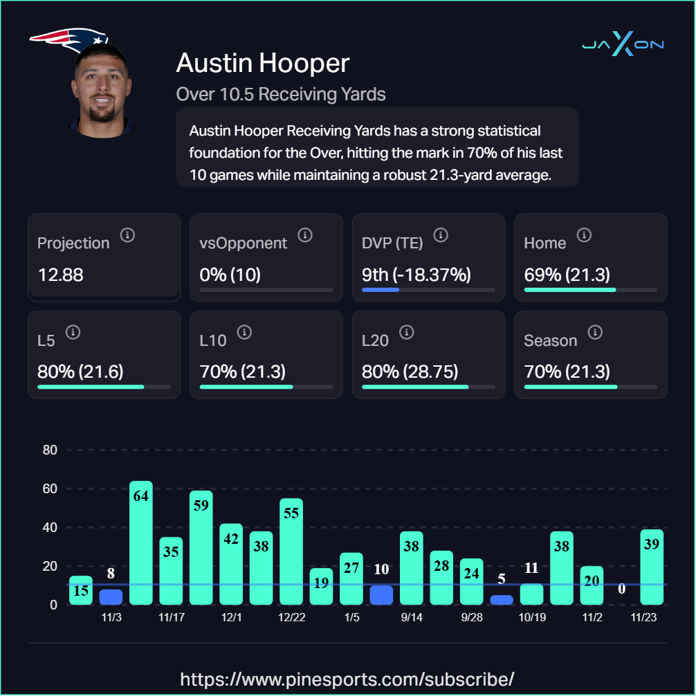 The Patriots tight end averages 21.3 yards per game this season—literally double this line. He's hit the over in 80% of his last five games, and with Hunter Henry nursing a toe injury and appearing limited in practice, Hooper is about to see increased target share. At home, his average jumps to 24 yards. We're getting a guy who consistently produces 20+ yards at a line set for 10.5. That's disrespect.