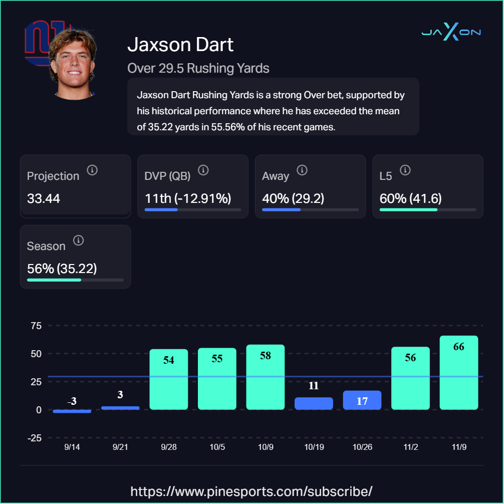 Jaxson Dart Over 29.5 Rushing Yards is pure value.