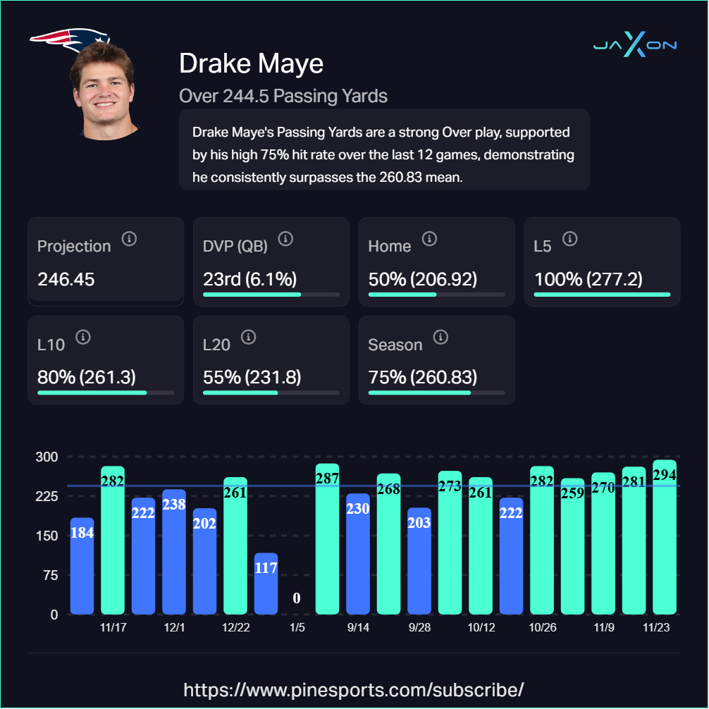 The Patriots' offensive line might be banged up, but Maye thrives under pressure—he literally leads the NFL in win probability added on pressured dropbacks. This number should be closer to 260, but we're getting 244.5.