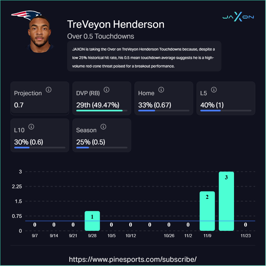 One of the surprises for New England this season has been the emergence of TreVeyon Henderson in the backfield. While most of his production is on the rush, 5 rushing touchdowns this season, he is also seeing nearly 3 targets per game and catching nearly everything thrown his way.
