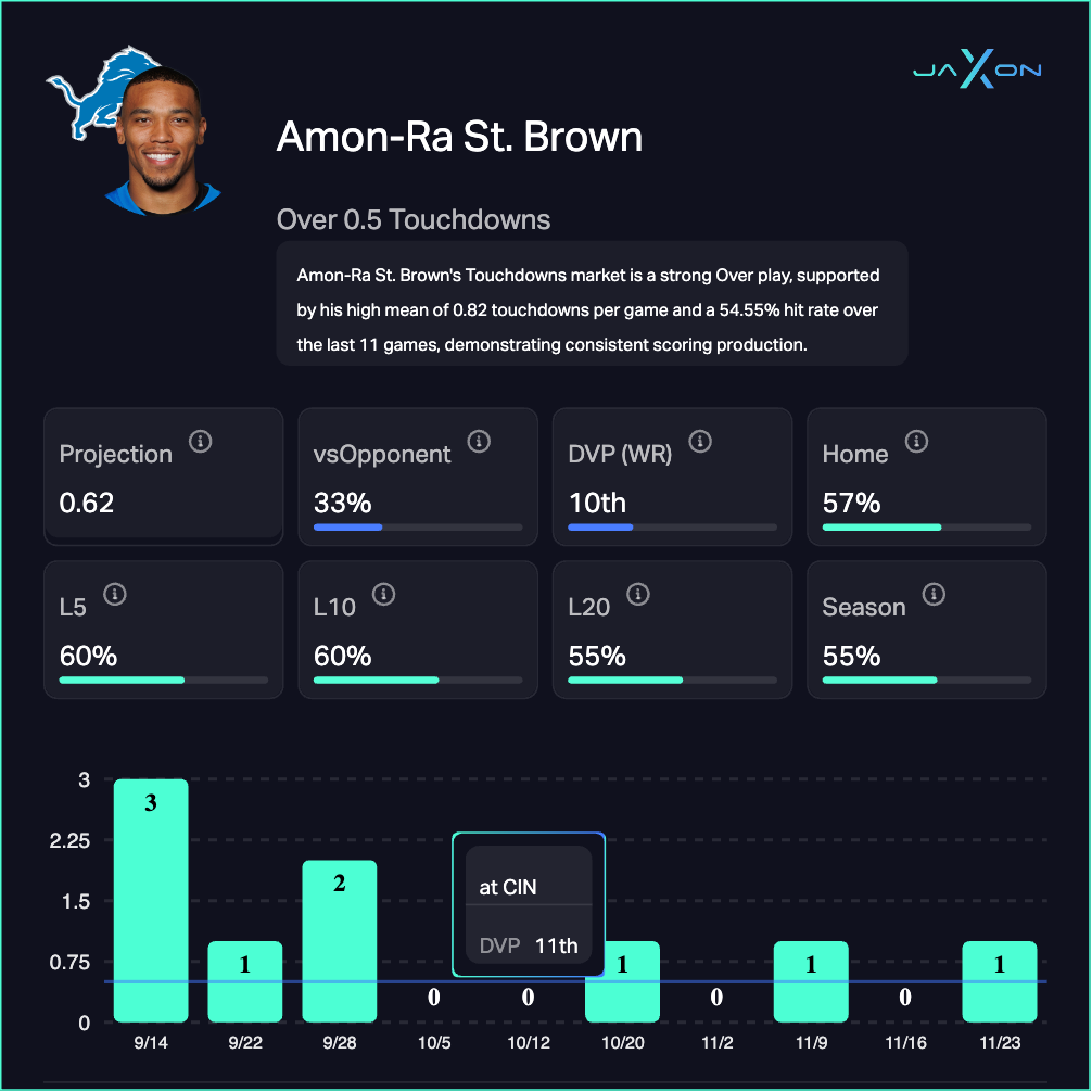 This season, St. Brown is entering the Thanksgiving matchup after a season-high 149 yards and a touchdown last week. He's knocking on the door of his third straight season with double-digit touchdowns. He's hungry. And he's facing a secondary thatโs bottom-5 in the league in passing TDs allowed.