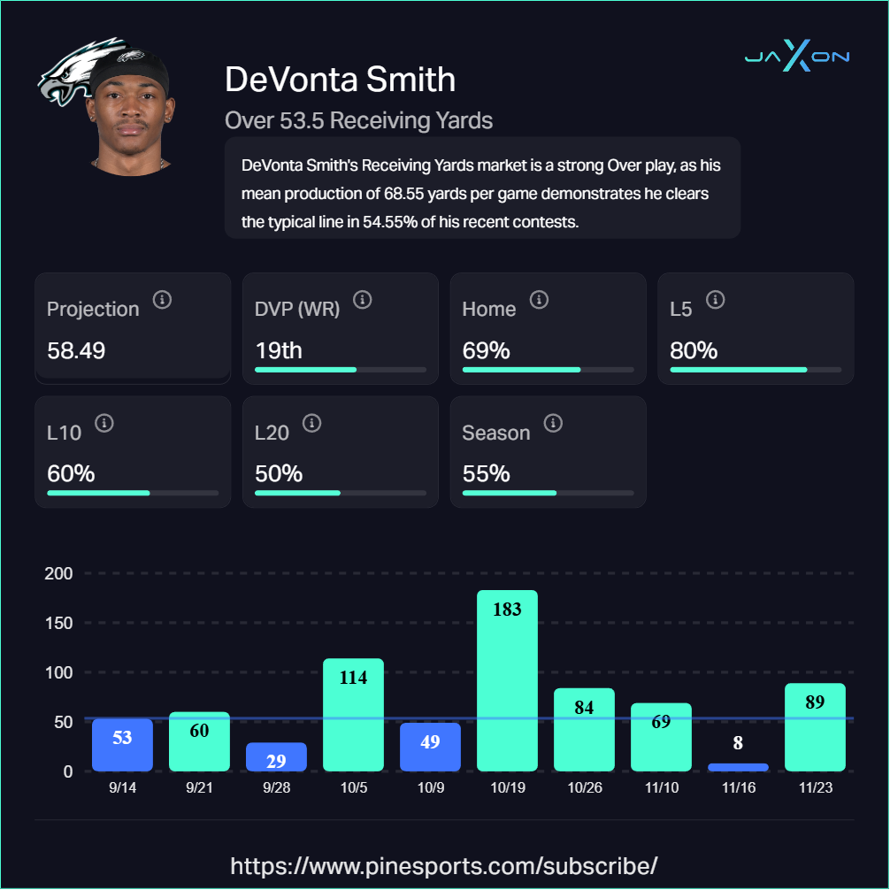 DeVonta Smith Over 53.5 Receiving Yards (-122)