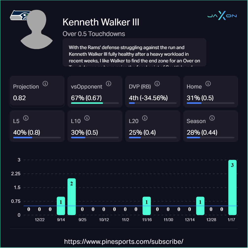 While Walker is primarily a rushing threat, his involvement in the passing game shouldn't be overlooked in a high-stakes playoff environment. He recorded 31 receptions this season and has a 100% catch rate inside the 10-yard line. If the Rams stack the box to stop the traditional run, look for Seattle to utilize Walker on screen passes or swings near the goal line.