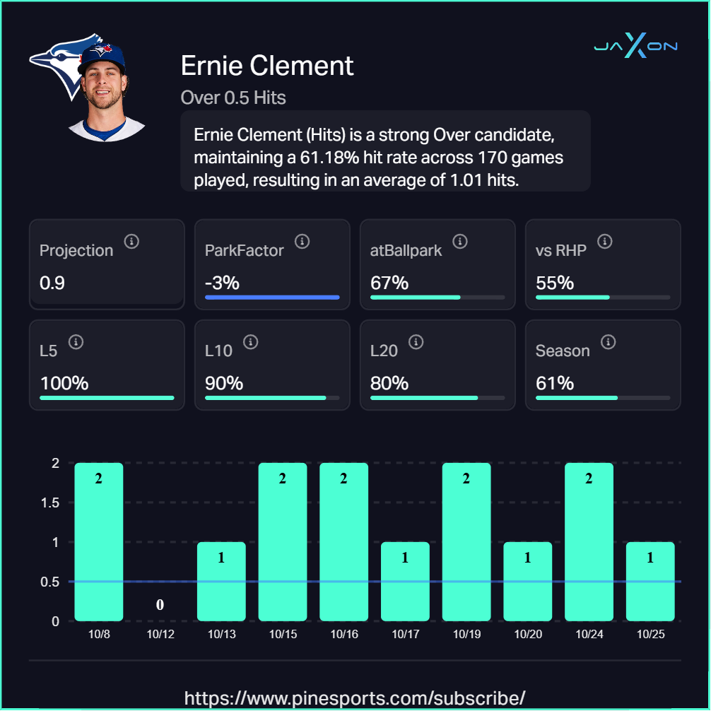 For hit props, Ernie Clement came through for us in Game 1 and he is easily my top choice again here in Game 3 to have Over 0.5 Hits at -166 on Draftkings. Ernie had 3 hits in Toronto over games 1 & 2 and his active hitting streak is up to 8 straight games. He’s 0-4 against Glasnow and I have a hard time seeing him go 0-7 as long as he gets a few tries.
