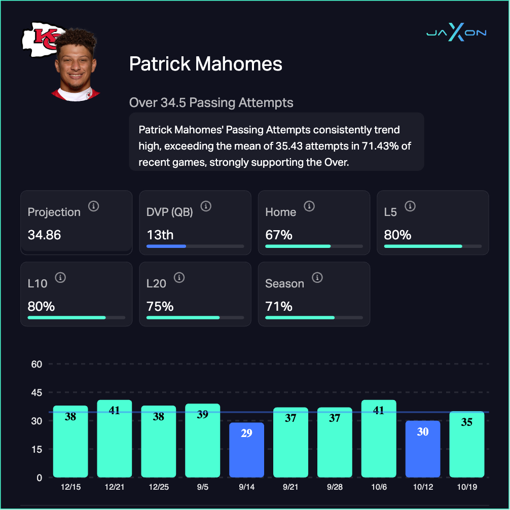 Mahomes is averaging 35.43 attempts per game this season. He's hit this over in 80% of his last 5, 10, and 15 games. This line should be closer to 37.