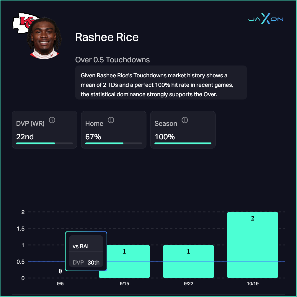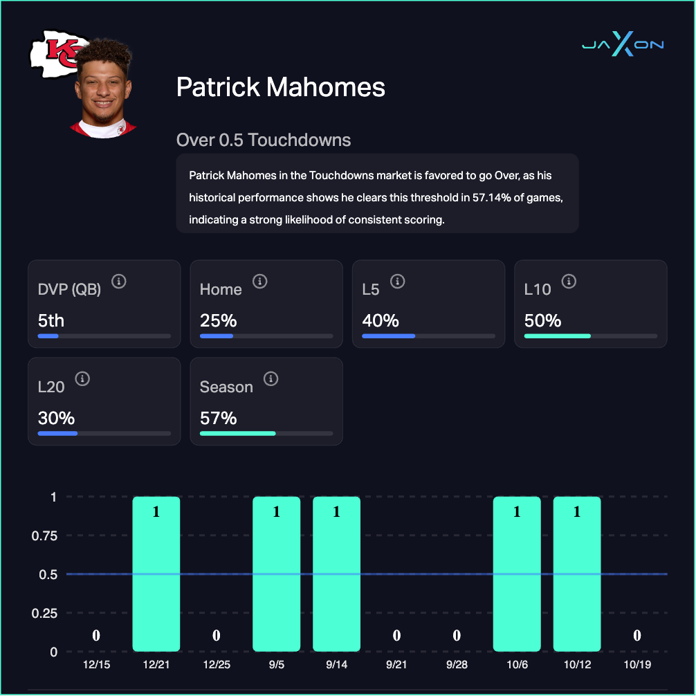 Whether you’re chasing player props, hunting +EV, or want instant answers to questions like “How does Patrick Mahomes perform on Monday Nights at home?”, Jaxon has you covered.