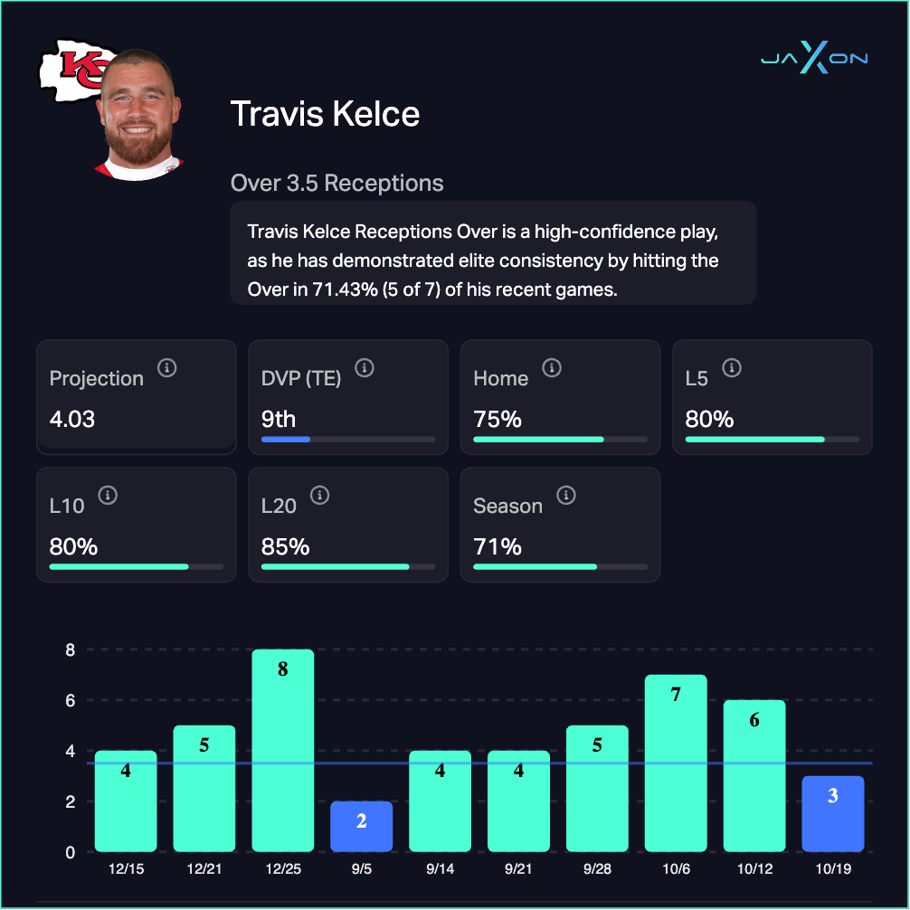Kelce averages 4.43 receptions per game and has hit this over in 80% of his last 5, 10, and 15 games. At home this season? He's averaging 4.5 receptions and hitting 75% of the time. This is the safest prop on the board.