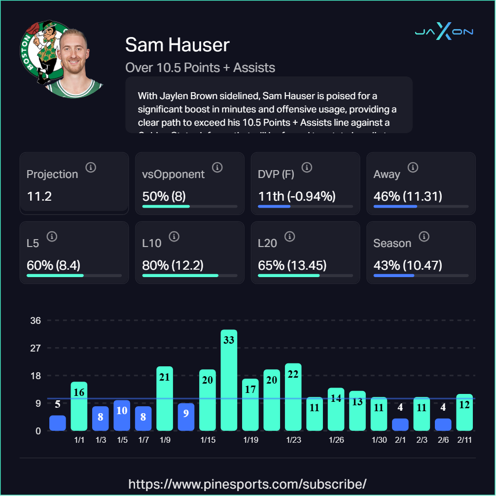 With Tatum out this season, Hauser's minutes and usage both get a meaningful bump. He's cleared 10.5 combined points and assists in eight of his last ten games, averaging 12.2 over that span and 14.8 over his last fifteen. Hauser operates in the 100th percentile for his position in shot frequency from non-corner threes, precisely the area where Golden State's defense gives up the most ground. This line underestimates his expanded role and the Warriors’ tendencies.