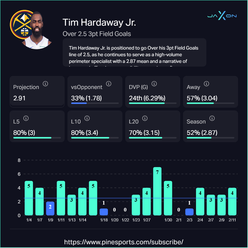 The Clippers rank dead last in defending non-corner threes, allowing opponents to shoot 37.4% from that zone. Hardaway Jr. takes 54% of his shots from that exact area and converts at 40%. Over his last ten games he's averaging 3.4 made threes and has hit this over in eight of them. In two meetings against the Clippers this season specifically, he's averaged four made threes per game and cleared the line both times. With Nikola Jokic orchestrating the NBA's most efficient halfcourt offense and defenses forced to account for him constantly, Hardaway Jr. will see open looks early and often.