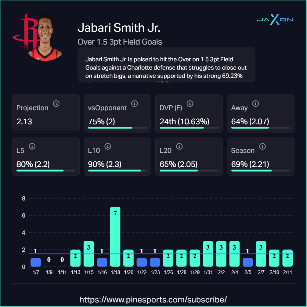 Smith Jr. has become one of the more reliable perimeter threats in the league, sitting in the 98th percentile for made threes among forwards this season. He's shooting 40.4% from the corner, and with Fred VanVleet sidelined, his usage has only grown. He's cleared 1.5 threes in nine of his last ten games, averaging 2.3 makes over that stretch. Charlotte's defense ranks 24th in threes allowed to forwards making this one of the more valuable plays on the board tonight.