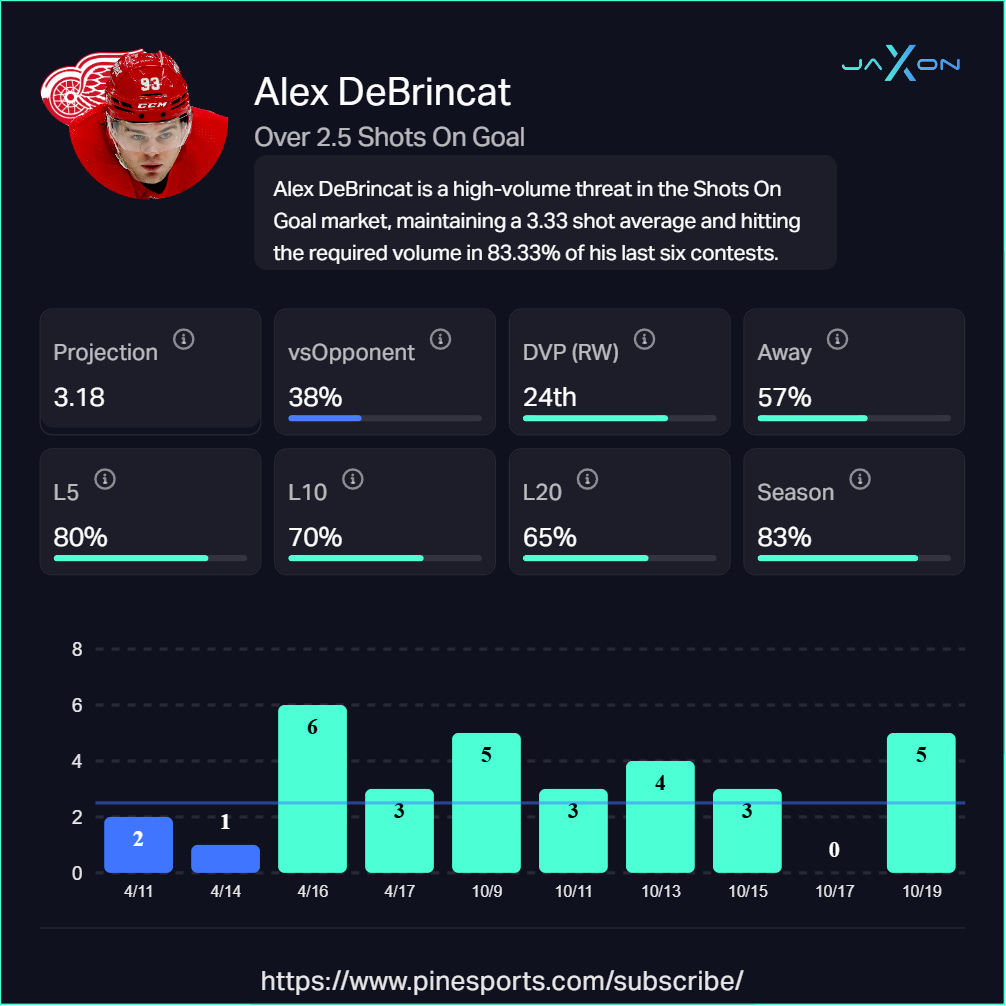 The Sabresā defense ranks 24th against opposing wingers in shot suppression, and their penalty kill has left open lanes for perimeter shooters. DeBrincatās usage rate on the top unit and his quick-release style make the over 2.5 an attractive number, especially with Detroit generating over 33 shots per game during their current streak.