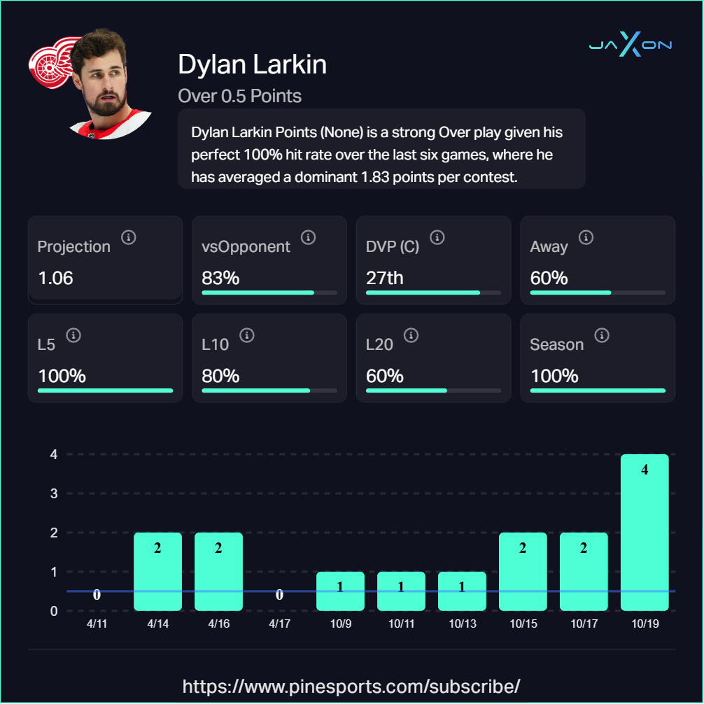 Larkin has been automatic to start the year, clearing this mark in all five of Detroitās wins while averaging two points per game. Heās thriving as the focal point of a top line thatās dictating pace and generating high-danger chances nearly every shift.