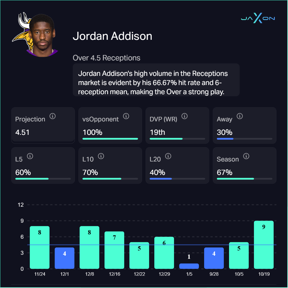 Addison has averaged 6.0 receptions per game this season and has cleared the 4.5 mark in two of his three starts. Over his last 10 games, heās averaging 5.7 catches, showing consistent involvement regardless of game script.
