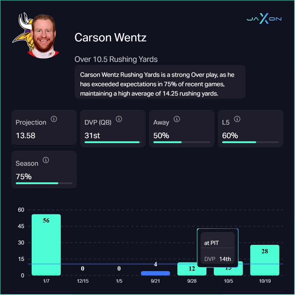 Wentz has been more active as a runner than the market gives him credit for, averaging 14.3 rushing yards per game and clearing this line in three of his four starts.