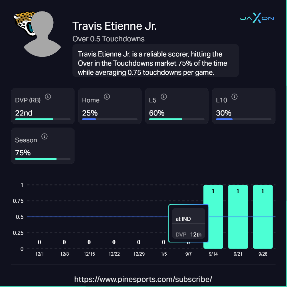 Etienne has been the engine behind Jacksonville’s success. He’s found the end zone in three of four games this season (75%) and he ranks 11th in the league with 11 red zone carries. That kind of usage makes him the Jaguars’ go-to option when they’re close to scoring.
