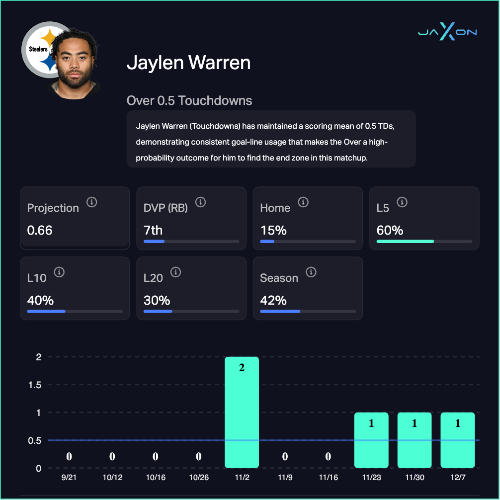 But here's what makes him ELITE for this bet: he's a dual threat. Warren has scored both rushing and receiving touchdowns this season, giving him multiple paths to pay off your ticket. In his last five games, he's hit the Anytime TD mark 60% of the time, and in a low-scoring, grind-it-out game where Pittsburgh will need short-yardage conversions, Warren is the absolute safest bet to score.