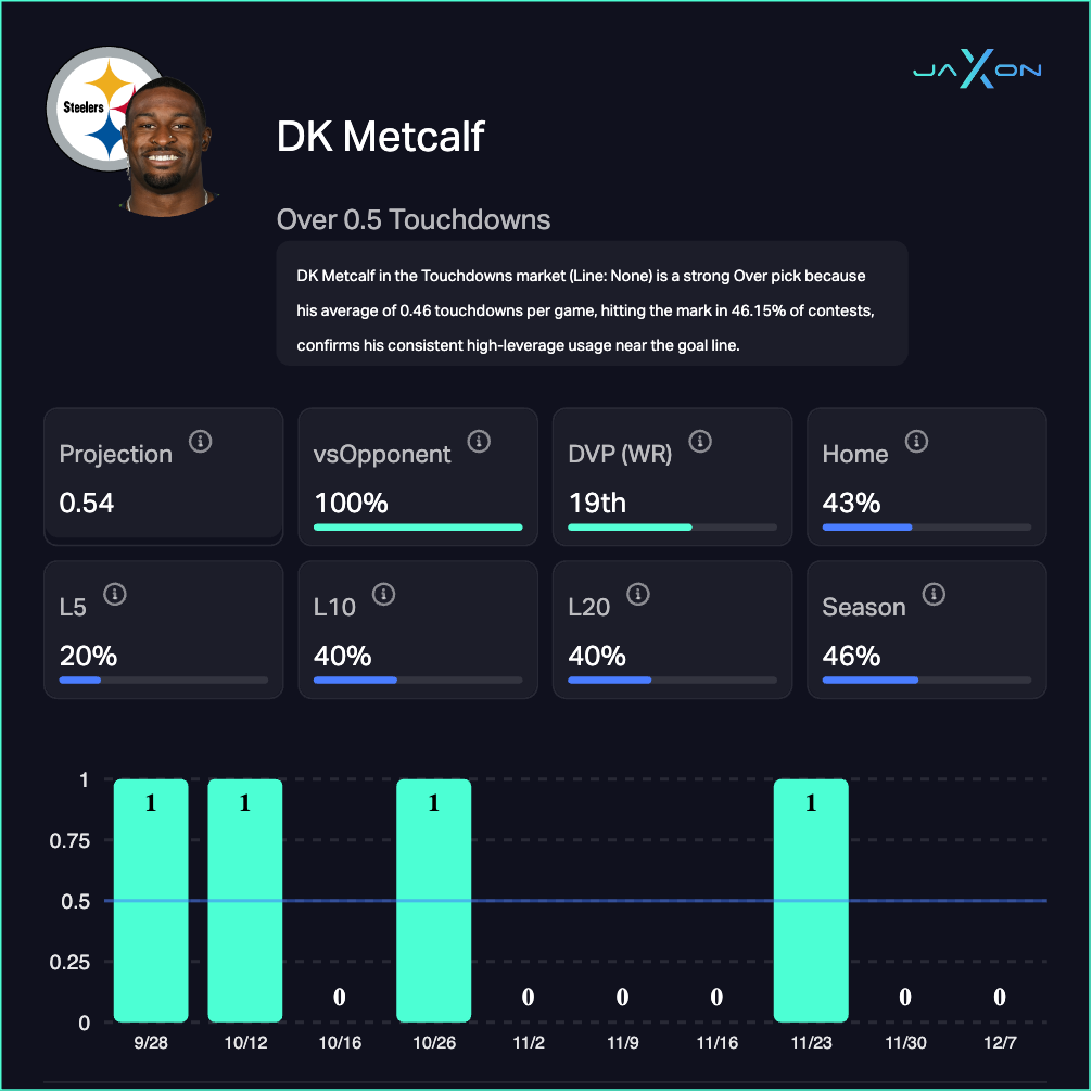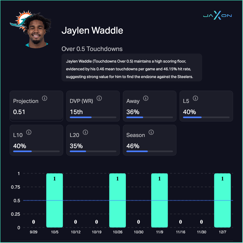 With Tyreek Hill on IR, Waddle commands a massive 24% target share and has 4 targets inside the 5-yard line this season. But here's the kicker: when playing away from home, Waddle has a 66.67% hit rate for scoring touchdowns. He's the undisputed focal point of Miami's passing attack, and even in a run-heavy game, his volume gives him multiple opportunities to find the end zone.
