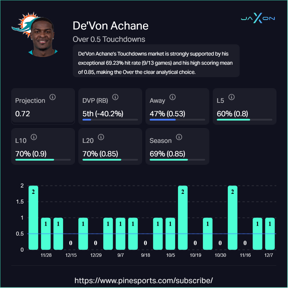 The obvious play may be to bet on Achane to go over his rushing prop or perhaps score a touchdown, and Jaxon certainly recommends the latter: