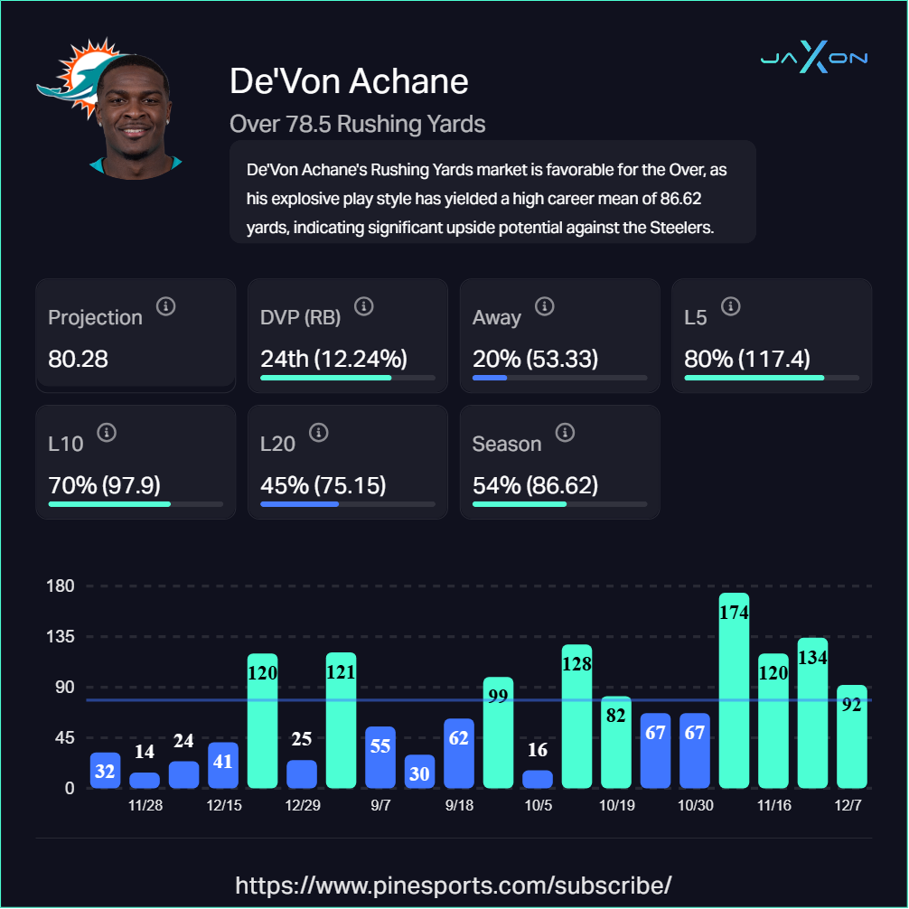 The Steelers' run defense ranks 21st in rushing yards allowed and 29th in missed tackle rate, but their pass rush is scary. The Steelers rank 7th in sacks (34) which matters because Miami's offensive line has struggled, and Tua Tagovailoa isn't exactly comfortable under pressure. That being said, T.J. Watt is out with a lung injury which significantly weakens that pass rush.