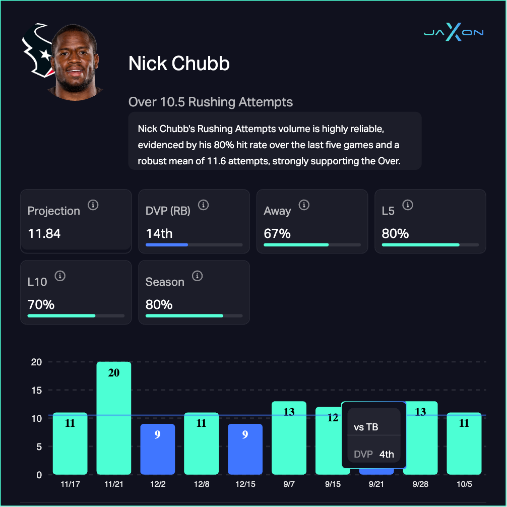 Chubb becomes Houston's entire offense with Kirk out. He's averaging 11.6 carries per game and hit the over in 80% of contests.