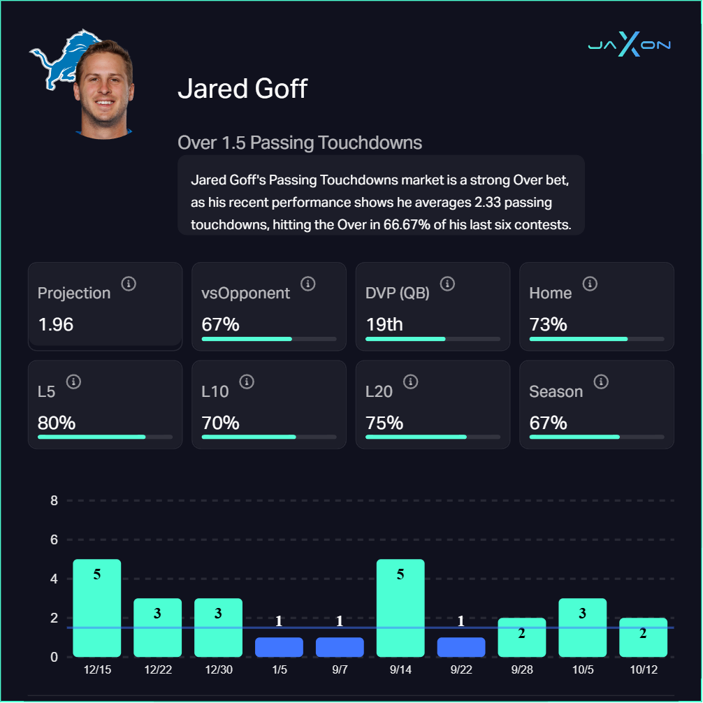 Goff’s been lights out at Ford Field with 3.5 passing TDs per home game this season. He now draws a defense that ranks 27th in passing yards allowed. Tampa’s run defense will force Detroit to air it out, which is exactly where they shine. With Goff leading the NFL in passing TDs per game (2.3) and Detroit ranked 3rd in Passing EPA, the over remains the sharp side.