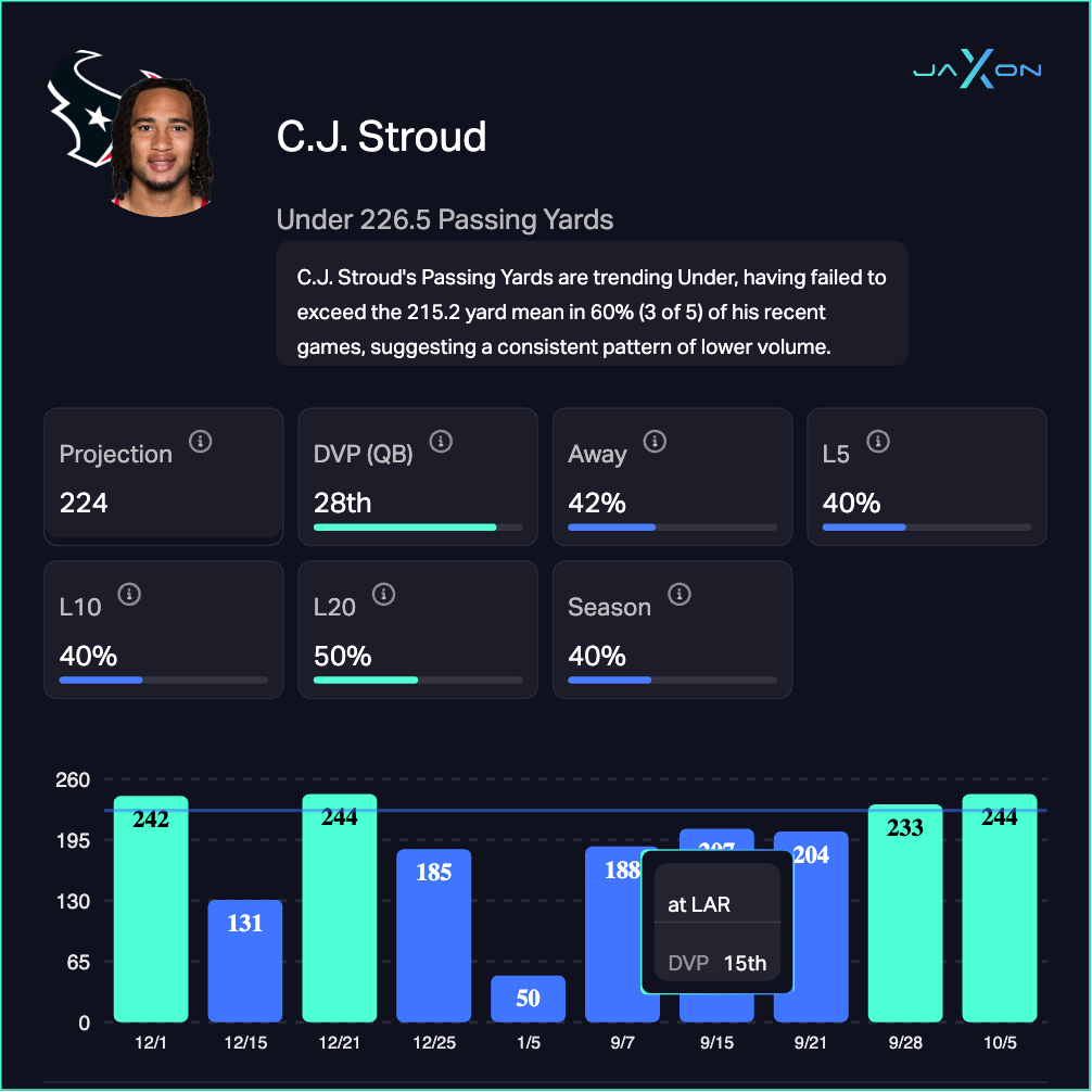Stroud is averaging just 215.2 yards per game this season, hitting the under in 60% of games. Now add Christian Kirk being OUT, persistent rain, and Seattle's secondary getting healthier.