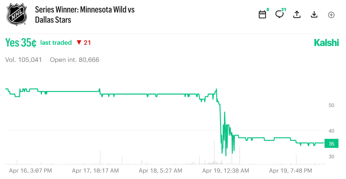 The Dallas Stars lost Game 1 to Minnesota 6-1, and the market reacted accordingly. Dallas went from series favorites at around -130 to sitting at +170 in the span of one bad night. On Kalshi the price initially fell to 32% but sharp money reacted quickly, bringing it back up to 35%.