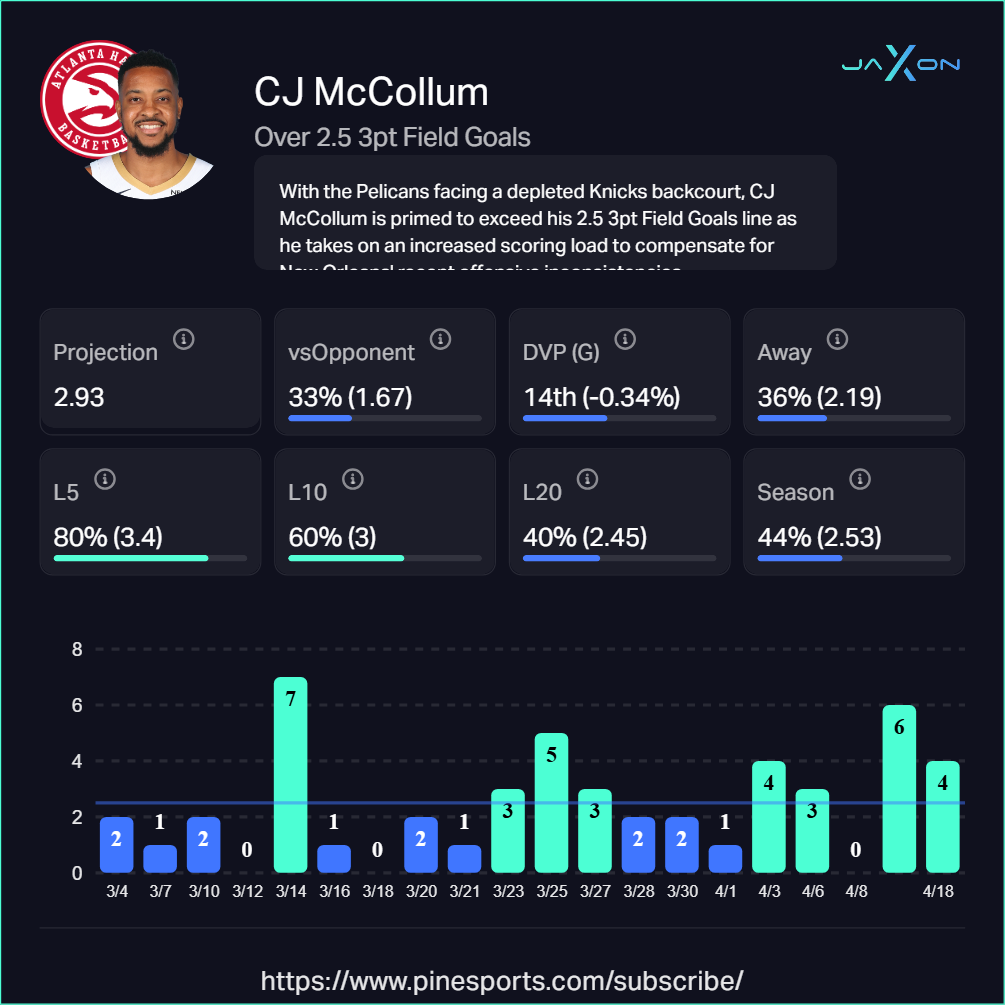 The Knicks are elite at defending corner threes, ranking first in frequency allowed at those locations, but McCollum operates primarily from the wings and above the break, where he shoots 37% and the Knicks are considerably less disciplined. He has hit this prop in two of three regular season games against New York this season.