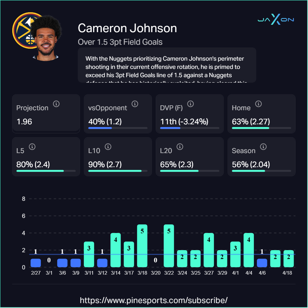 Johnson has cleared 1.5 made threes in 90% of his last ten games, averaging 2.7 makes during that stretch. He shoots 43% from three on the season and 48% specifically from the corners, where he does the majority of his work. Minnesota's defense ranks 27th in effective field goal percentage allowed on corner threes.