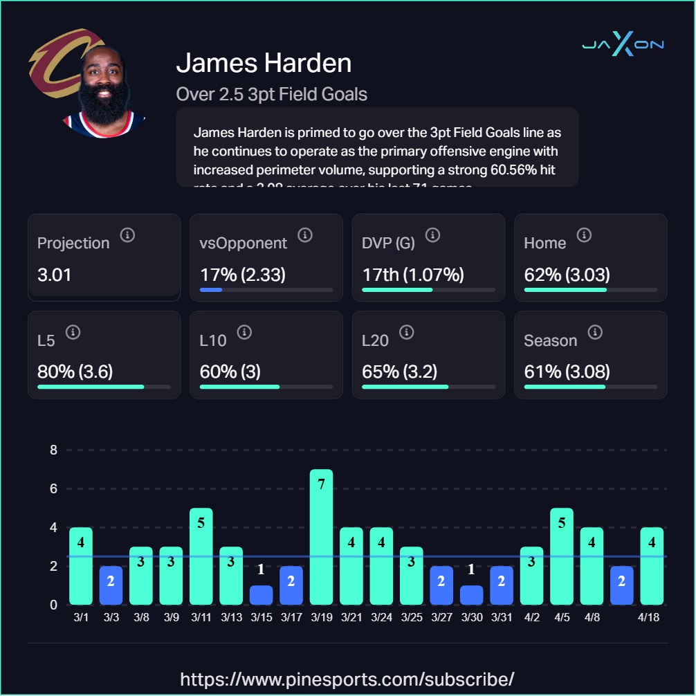Harden averaged 8.2 three-point attempts per game this season and has hit this prop in 80% of his last five games and 65% of his last 20. Toronto ranks 17th in point guard defense and struggles specifically against isolation scorers who can create their own looks off the dribble. Harden is in the 92nd percentile for three-pointers made at his position. In Game 1 he and Donovan Mitchell combined for eight makes from deep. The Cavaliers are a high-volume three-point team and Harden is their primary floor spacer.